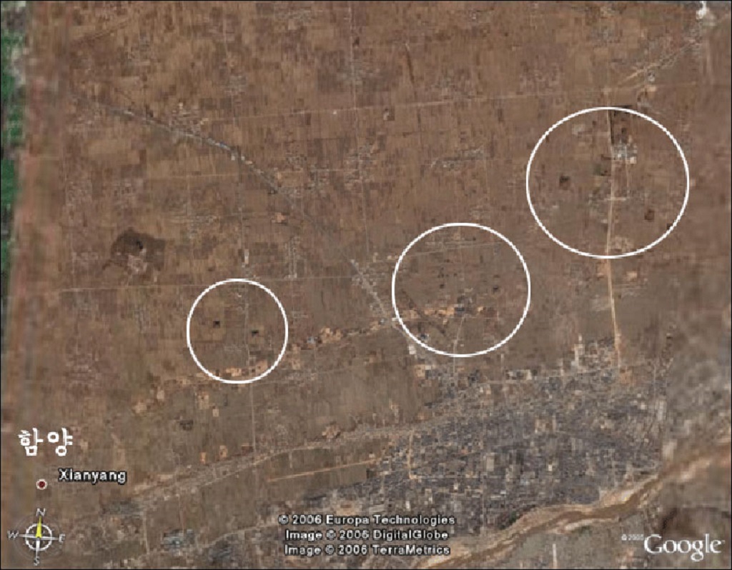 (사진) 지나(China) 서안(長安)-함양(咸陽) 고대조선(한국+배달국+조선+부여) 유적. 고구려식 축성 적석총피라미드 묘(廟) - Google 촬영.